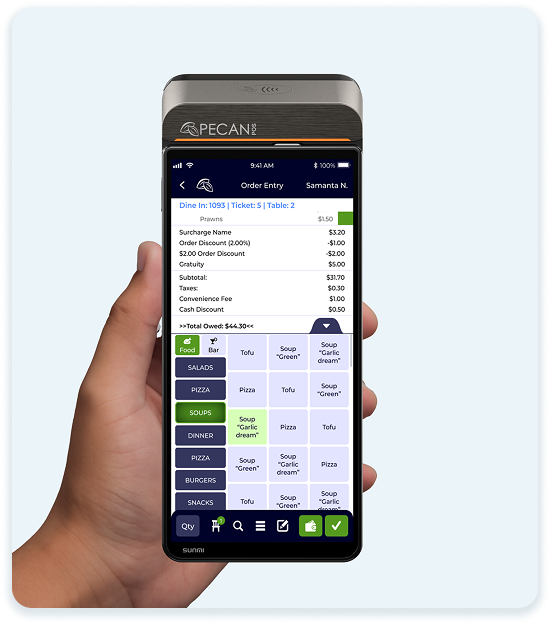 Revolutionize your table service with the innovative Pecan Mobile, especially when paired with the Sunmi P3 —one of the slimmest and lightest devices in the industry.